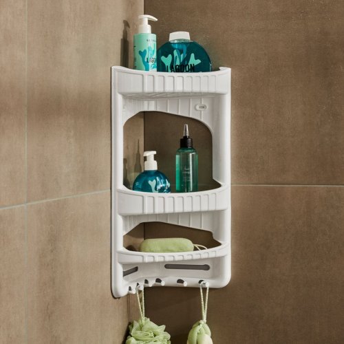 Trojposchodová rohová plastová polica s háčikmi na zavesenie, určená na montáž na stenu. Rozmery 20 x 20 x 60 cm (Š x H x V). EAN 8696287091668