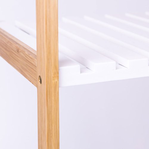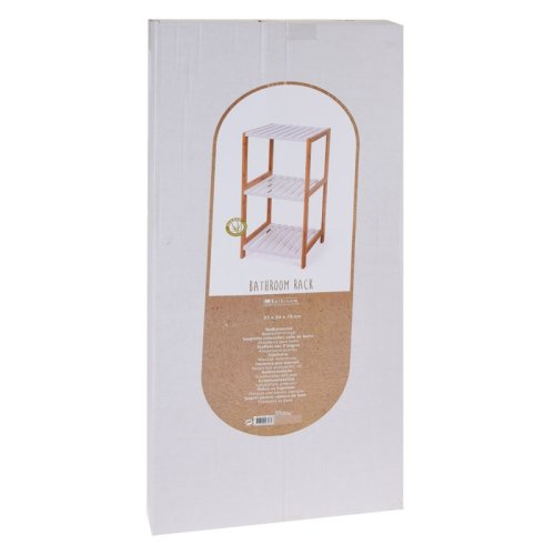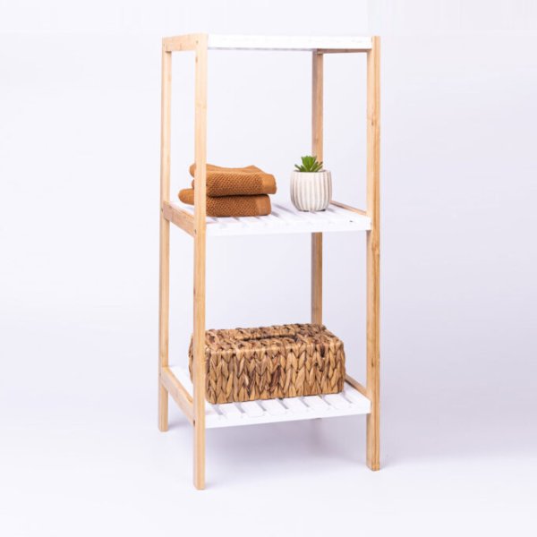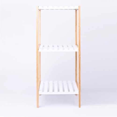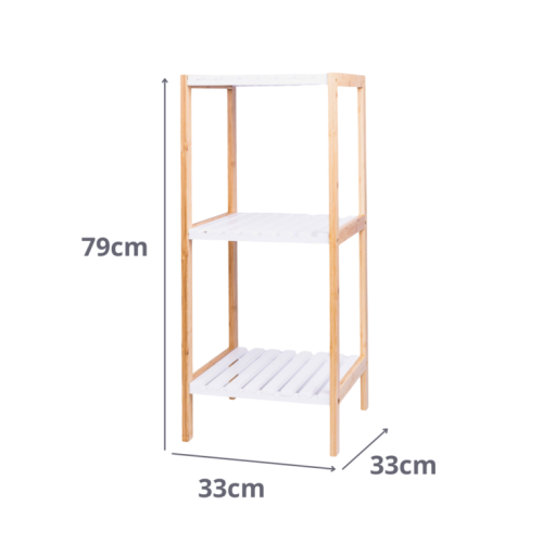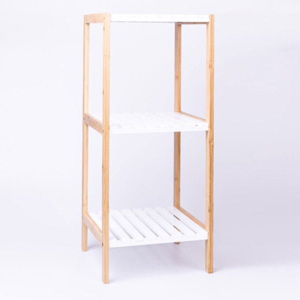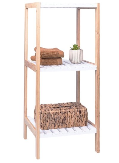 kúpeľňový regál, 3 police mdf, bambusové nohy s bielymi policami, rozmer 33x34xh79cm, nohy 13x32mm