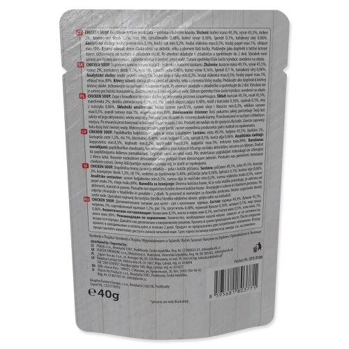 Zloženie: kuracie mäso 49,3%, vývar 45,5%, mrkva 2%, zemiakový škrob 1,2%, ryža 1%, zahusťovadlo 0,48%, kuracie vývar 0,36%, špenát 0,1%, tuniakový olej 0,06%.