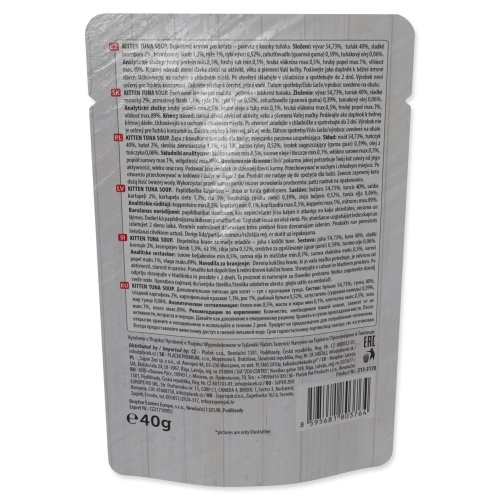 Doplnkové krmivo pre mačiatka – polievka s kúskami tuniaka, ktorú môžete dopriať samostatne alebo ako doplnok k suchému krmivu.