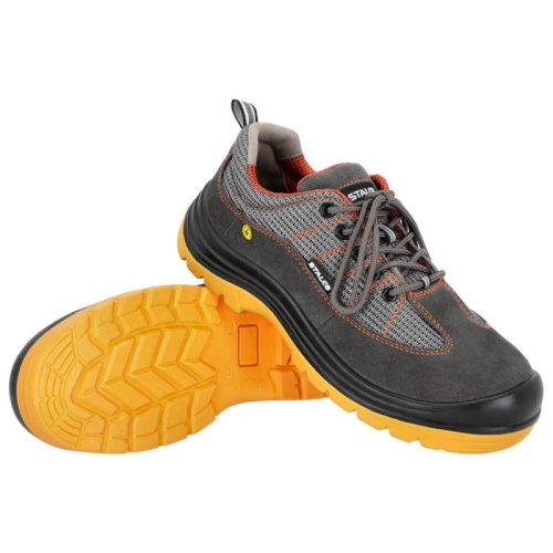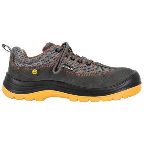 Ľahká pracovná obuv s ochrannou triedou S1P a ESD vlastnosťami, vhodná do prostredia, kde je kladený dôraz na bezpečnosť. Kombinácia kvalitných materiálov zaisťuje pohodlie, priedušnosť a spoľahlivý výkon pri každodennom nosení. Bezpečnosť zaisťuje kovová špička chrániaca prsty pred nárazmi a oceľová vložka proti prepichnutiu. Podošva z dvojvrstvového polyuretánu je protišmyková, odolná voči olejom a antistatická. Pre vyššiu odolnosť je špička zosilnená PU povlakom, zatiaľ čo uzavretá päta s koženým prvkom zaisťuje stabilitu a pohodlie. Reflexné prvky a pevné polyesterové šnúrky zvyšujú bezpečnosť pri práci.