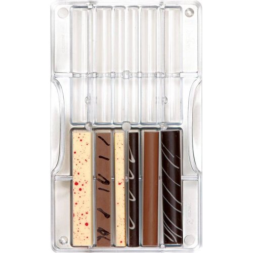 Polykarbonátová forma na čokoládu v tvare čokoládových tyčiniek.