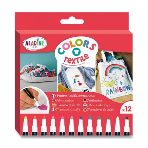 Súprava kvalitných popisovačov Aladine Textile Colors na textil s plsteným hrotom. Popisovače v základných farbách. Pre zachovanie farby nechajte uschnúť a prežehlite žehličkou po dobu 5 minút po rube látky. Možno prať v práčke pri teplote 40 °C. Pred použitím je vhodné látku vyprať na zaistenie lepšej absorpcie farieb. Možnosť aplikácie na rôzne druhy textílií, tenisky, peračník atď. Vhodné na tvorenie s deťmi. Šírka stopy 1 mm.