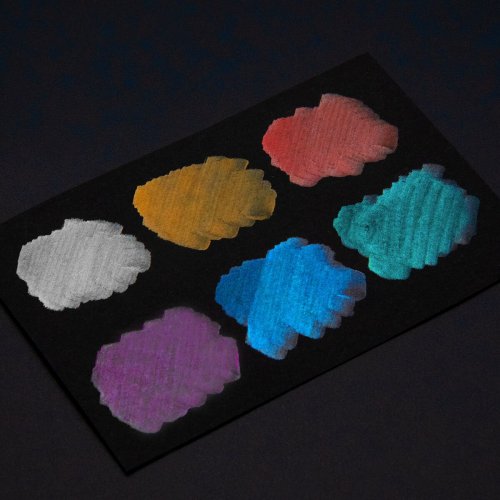 • metalické farby vyniknú na tmavom papieri, * štetcový hrot, * jasný pigment, * ľahké vedenie