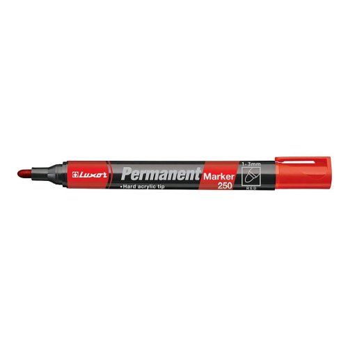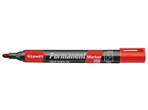 Permanentný popisovač LUXOR 250 červený s okrúhlym hrotom je možné použiť na väčšinu povrchov.