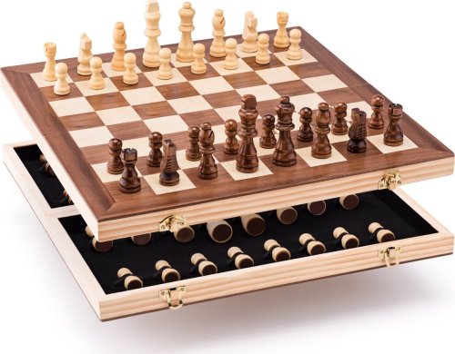 Šach sú jedna z najobľúbenejších klasických stolných hier na svete. Získali si mnoho priaznivcov rôzneho veku zo všetkých kútov sveta a právom sú označované ako „kráľovská hra“. Hra obsahuje: drevené šachové figúrky, drevenú polstrovanú otváraciu šachovnicu s gumičkami na upevnenie figúrok. Rozmery: šachovnica 38 x 38 cm, výška kráľa 7,6 cm, šírka políčka 4,1 x 4,1 cm.