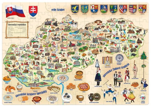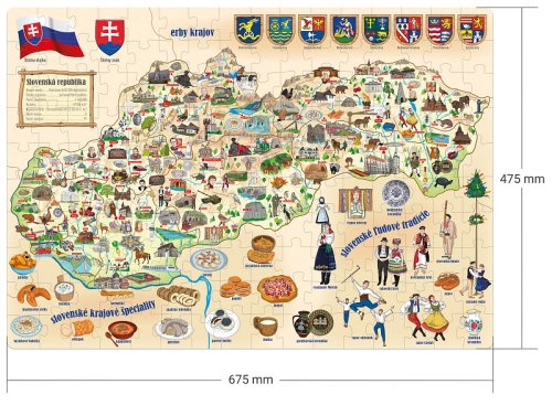 Zemepisné puzzle pre deti s mapou Slovenskej republiky a ilustráciami od výtvarníčky Hany Vavrínovej. Na mape nájdete ľudové tradície, krajové špeciality, vlajku či štátny znak a ďalšie užitočné informácie. Všetky texty na mape sú uvedené v slovenskom jazyku. Skladanie farebných dielikov rozvíja u detí postreh, zručnosť a sústredenie. Obrázky predstavujúce zvieratá, rastliny či budovy navyše stimulujú u najmenších detí predstavivosť a pomáhajú im spoznávať veci charakterizujúce Slovensko. Rozmer zloženého puzzle cca 67,5 x 47,5 cm