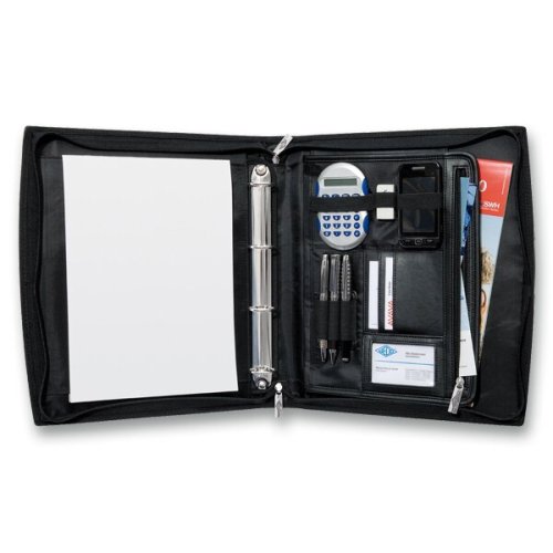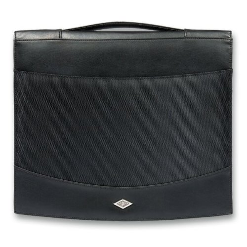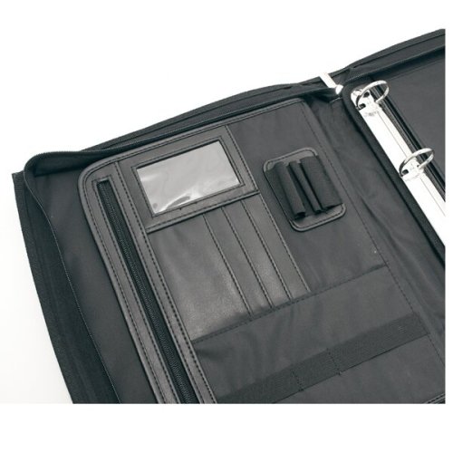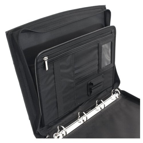4krúžkový mechanizmus (Ø 35 mm, výška plnenia 24 mm) - je možné vybrať, * otvorené vnútorné vrecko na dokumenty formátu A4, * 1 vnútorné vrecko na zips, * vrecká na vizitky, kalkulačku, * 3 pútka na ceruzky a 3 ďalšie elastické pútka rôznych šírok na drobné potreby, * držadlo pre ľahké prenášanie, * materiál: kombinácia vysoko kvalitnej syntetickej kože a štruktúrovaného nylonu, * farba: čierna, * rozmer: 360 x 315 x 60 mm
