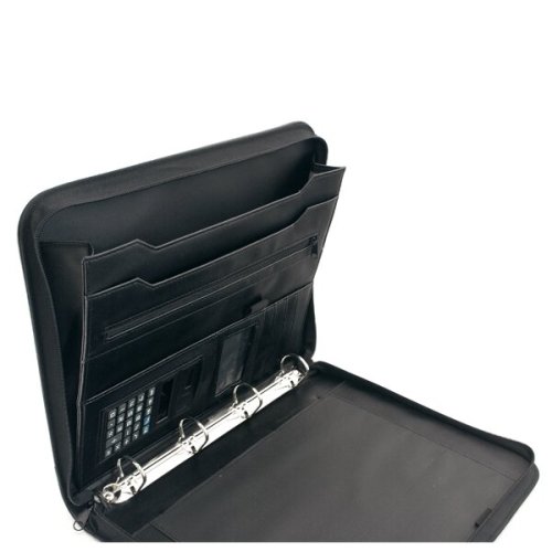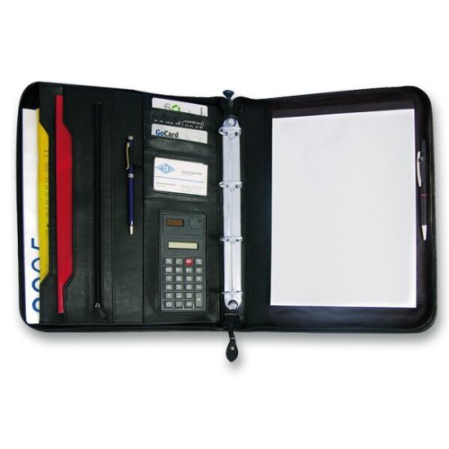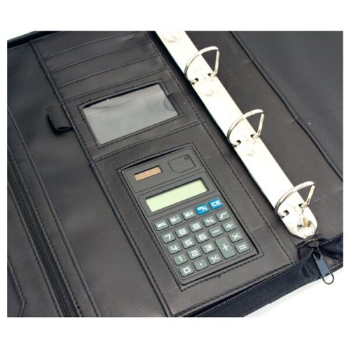 4krúžková mechanika, * priemer krúžkov 34 mm, výska plnenia 31 mm, * kalkulačka na kombinované solárne napájanie a batériové, * vrecko na blok A4, * vrecko na zips, * 4 vrecko na karty, * pútko na pero, * Zapínanie na obojstranný zips, * materiál: kvalitný zr x 360 x 55 mm.