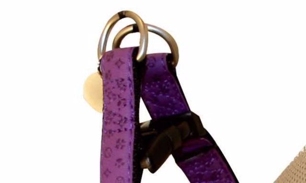 Kožený postroj fialovej farby s celopotlačou, podšitý jemným nylonom v rovnakej farbe.