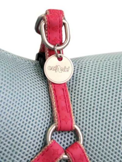 Kožený postroj ružovej farby s celopotlačou, podšitý jemným nylonom v rovnakej farbe.