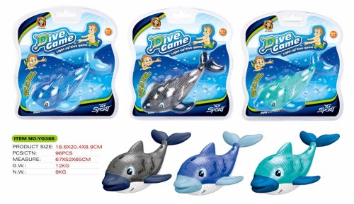 Potápací delfín so svetlom o veľkosti 14 cm. Po vložení do vody svieti. Prevádzka na 3 gombíkové batérie AG13 (súčasťou balenia).