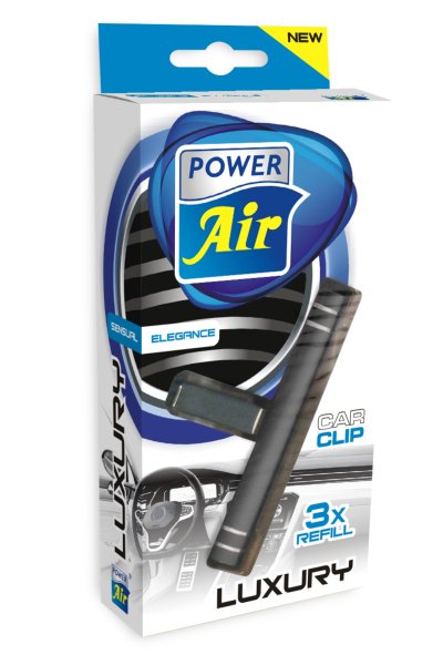Osviežovač POWER AIR Luxury je exkluzívny osviežovač do mriežky ventilátora. Špeciálna bavlnená vložka naplnená vonnou esenciou je umiestnená v luxusnom kovovom púzdre čiernej farby.