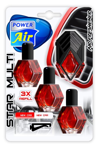 Osviežovač POWER AIR Star Multi je kvapalinový osviežovač 3 v 1 s objemom 3 x 9 ml na pripevnenie do mriežky. V balení puzdro ("strojček"), sponka a 3 osviežovače.