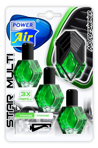 Osviežovač POWER AIR Star Multi je kvapalinový osviežovač 3 v 1 s objemom 3 x 9 ml na pripevnenie do mriežky. V balení puzdro ("strojček"), sponka a 3 osviežovače.