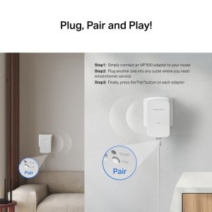 Zapojte prvý adaptér do zásuvky pri routeri, druhý do zásuvky pri zariadení a stlačte na oboch tlačidlo „Pair“ – vytvorenie siete trvá len pár sekúnd. Plug & Play riešenie nevyžaduje žiadne technické znalosti ani nastavovanie.