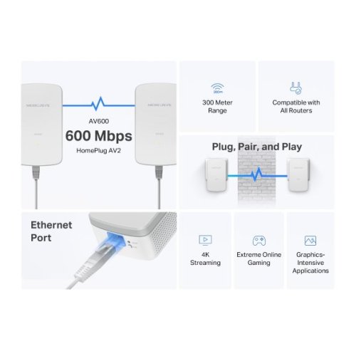 MP300 KIT prenáša internetové pripojenie rýchlosťou až 600 Mbps prostredníctvom existujúcich elektrických rozvodov. Spoľahlivý prenos bez rušenia Wi-Fi signálu as dosahom až 300 metrov umožní bezproblémové streamovanie videa v 4K, hranie hier aj online prácu.