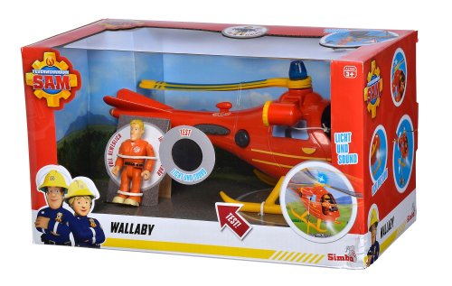 Vrtuľník s figúrkou Toma z obľúbeného seriálu Požiarnik Sam. Modrý svetelný efekt, svetlomet a zvukový efekt. Otočná vrtuľa, mechanický navijak a príslušenstvo. Dĺžka 15 cm