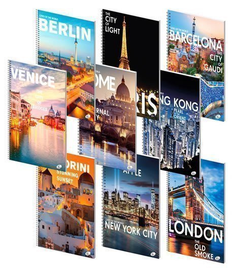 Svetové metropoly zachytené na fotografiách tvoria kolekciu obalov kvalitných poznámkových blokov. Pevná obálka s matným povrchom a lesklým lakom zvýraznenými detailmi vo väzbe striebornej dvojitej špirály. Formát bloku A4, 70 listov (papier 70 g), linajkový. Celkom 9 rôznych motívov. Balenie: 25 ks.