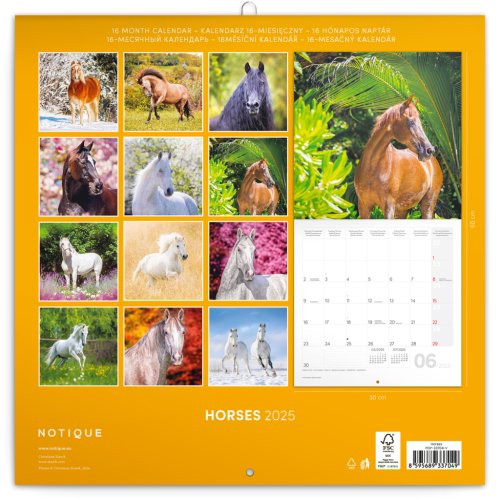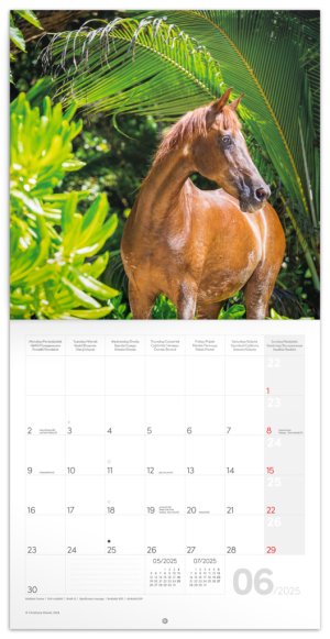 Majestátna krása koní na 12 snímkach známej nemeckej fotografky Christiane Slawik. V kalendári okrem fotiek nájdete prehľadné kalendárium od septembra 2024 do decembra 2025 v šiestich jazykoch, fázy mesiaca, dôležité sviatky a priestor pre poznámky na každý deň.