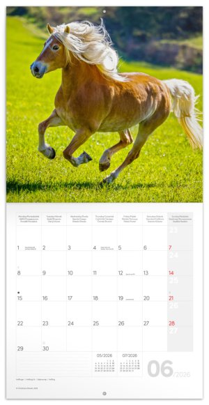 Majestátna krása koní na 12 snímkach známej nemeckej fotografky Christiane Slawik. V kalendári okrem fotiek nájdete prehľadné kalendárium od septembra 2025 do decembra 2026 v šiestich jazykoch, mesačné fázy, dôležité sviatky a priestor pre poznámky na každý deň.