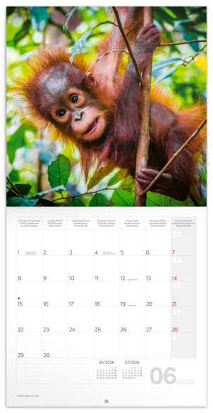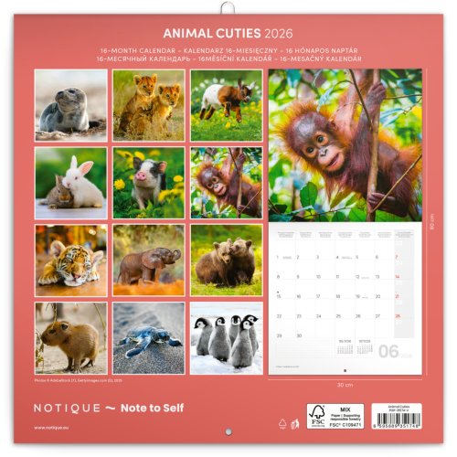 Fotografie roztomilých prasiatok, opičiek alebo uškatcov vám budú robiť radosť celý rok. V kalendári okrem fotiek nájdete prehľadné kalendárium od septembra 2025 do decembra 2026 v šiestich jazykoch, mesačné fázy, dôležité sviatky a priestor pre poznámky na každý deň.