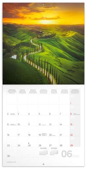 Dvanásť prekrásnych krajinných fotografií z rôznych kútov sveta. Kalendár obsahuje prehľadné kalendárium od septembra 2024 do decembra 2025 v ôsmich jazykoch, fázy mesiaca, dôležité sviatky a priestor pre poznámky na každý deň. Kalendár je súčasťou kolekcie Plastic Free, je zabalený v obálke z recyklovaného papiera a je tlačený na recyklovaný štruktúrovaný papier s vysokou gramážou.