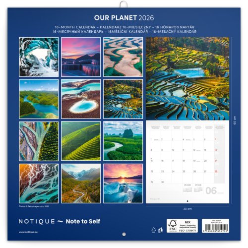 Dvanásť prekrásnych krajinných fotografií z rôznych kútov sveta. Kalendár obsahuje prehľadné kalendárium od septembra 2025 do decembra 2026 v šiestich jazykoch, mesačné fázy, dôležité sviatky a priestor pre poznámky na každý deň.