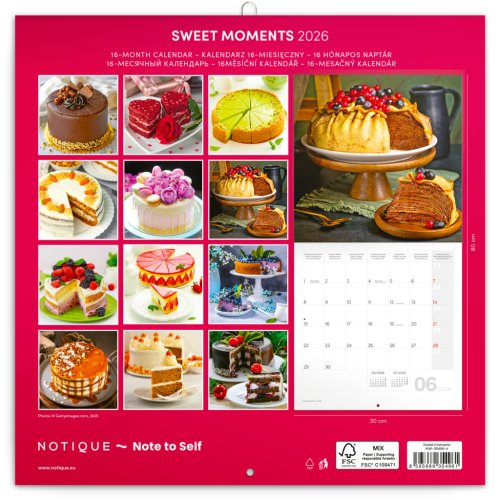 Jedinečný kalendár pre všetkých milovníkov sladkostí! Ochutnajte rôzne druhy tort na stránkach tohto kalendára. Vnútri nájdete šesťjazyčné kalendárium, mesačné fázy, dôležité sviatky a priestor pre vaše poznámky a plány.