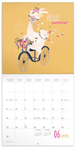 Ilustráciám dominujú lamy zachytené vo všetkých možných situáciách. Vnútri kalendára nájdete prehľadné kalendárium od septembra 2024 do decembra 2025 v šiestich jazykoch, fázy mesiaca, dôležité sviatky a priestor pre poznámky na každý deň. Kalendár obsahuje hárok dočasných tetovačiek, s ktorými si užijete veľa zábavy.