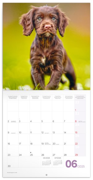Roztomilé šteniatka na fotografiách v poznámkovom kalendári. Vnútri nájdete prehľadné kalendárium od septembra 2024 do decembra 2025 v šiestich jazykoch, fázy mesiaca, dôležité sviatky a priestor pre poznámky na každý deň.