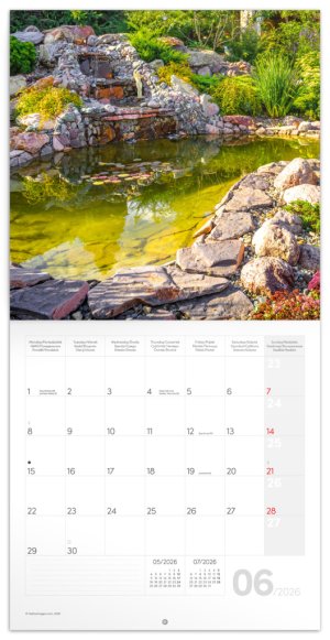 Rozjasnite svoj interiér farebnými fotografiami šľachtených záhrad. V kalendári okrem fotiek nájdete prehľadné kalendárium od septembra 2025 do decembra 2026 v šiestich jazykoch, mesačné fázy, dôležité sviatky a priestor pre poznámky na každý deň.