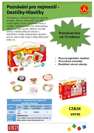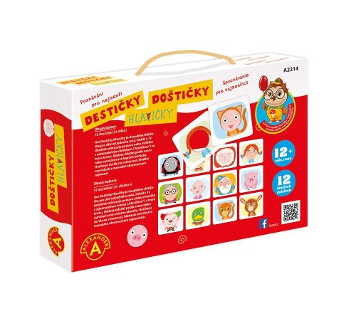 Poznávacia jednoduchá náučná skladačka, ktorá rozvíja základné schopnosti a znalosti batoliat od 12. mesiaca veku. Rozvíja logiku, hmat a spoznávajú farby a zvieratká alebo postavičky. Hra zo série "Sovička múdra hlavička". Princípom je priradiť hlavičku k správnej postave, ktorá k sebe patrí. Tým deti rozvíja logiku, hmat a spoznávajú farby a zvieratká. Každá doštička má odnímateľnú tvár v tvare kruhu. Počas hry dieťa vníma a vkladá dieliky do otvorov v doštičkách. Podľa zobrazených obrázkov pozná, či k sebe malý a veľký dielik patrí alebo nie. Na umiestnenie dielikov do otvoru, dieťa najprv preskúmava jeho tvar a správne natočenie. Pokiaľ hlavičky nebudú priradené správne, vzniknú tak smiešne obrázky. Hra precvičuje motoriku ručičiek a motivuje k lepšiemu vnímaniu a logickému mysleniu. Garantom poznávacích hier je uznávaná psychologička z varšavskej univerzity Alexandra Petrovská. Hra je vhodná pre deti od 12 mesiacov do 3 rokov. BALENIE OBSAHUJE: - 12 veľkých farebných doštičiek s obrázkami - český a slovenský návod k hre Obsah balenia: 12 veľkých farebných doštičiek s obrázkami z pevného kartónu (24 dielikov), český a slovenský návod k hre, pevnú škatuľu s uchom pre ľahké prenášanie.