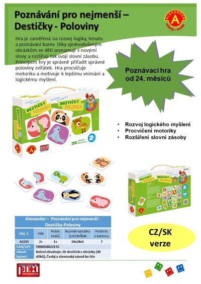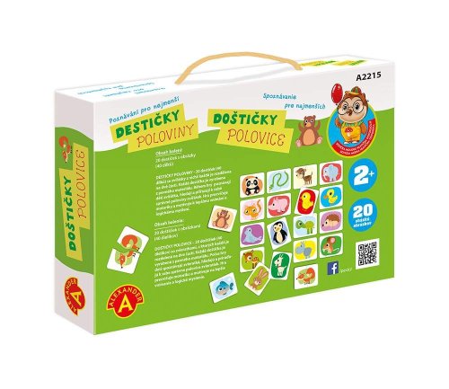 Obsah balenia: 20 doštičiek s obrázkami z pevného kartónu (40 dielikov), Český a slovenský návod k hre, pevnú škatuľu s uchom pre ľahké prenášanie