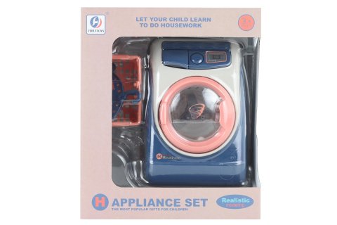 Plastová práčka na batérie vydáva zvuky. Po zapnutí sa spustí zvuk napustenia vody, potom sa začne bubon práčky otáčať. Batérie nie sú súčasťou (napájanie 2 AA). Rozmery práčky cca 15 x 9,5 x 8 cm. Rozmery balenia cca 17 x 20 x 9,5 cm. Vek 3+