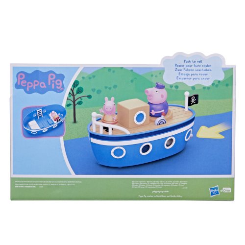 Predškoláci a všetci, ktorí majú radi prasiatko Peppa, si budú radi predstavovať všetky miesta, kam by s Peppou mohli cestovať v tejto ľahko otvárateľnej lodičke! Figúrka Peppy, ktorá je súčasťou balenia, môže plávať na hornej palube alebo v podpalubí. Loďka má skutočné posuvné kolieska, figúrku prasiatka dedka a odnímateľnú hornú dosku.