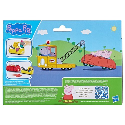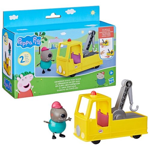 Tu je set Prasiatko Peppa Ťažný automobil Dedy psa! Stačí vytiahnuť vozidlo dozadu a potom ho pustiť, aby sa rozbehol vpred! Deti môžu ovládať hák, pripojiť ho k ďalšiemu vozidlu zo série Prasiatko Peppa a ťahať auto, kamkoľvek chcú!