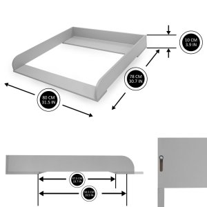 Drevený prebaľovací nadstavec. Jednoduchá montáž a rozloženie. Predná doska tohto prebaľovacieho pultu je flexibilná a je možné ju posúvať až o 4 cm. Rozmery: 80 (š) x 78 (h) x 10 (v) cmVhodné pre položky IKEA:1. Nordli (hĺbka 47 cm)2. Malm (hĺbka 48 cm)3. Hemnes (hĺbka 50 cm)