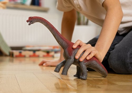 Obrovský Brachiosaurus je vidieť už zďaleka: Jeho dlhý krk, vysoký ako dom, vyčnieva nad korunami stromov. Čo tam vlastne robí? Ostrými zubami trhá z konárov listy a vetvičky. Pri jedle ho len málokedy niečo rušia, a to nielen vďaka jeho veľkosti. Prehistorický obor je od hlavy až po špičku chvosta pokrytý ohnivo červenou jašteriou kožou. Brachiosaurus sa tak múdro bráni útočníkom. Ako vegetarián však obvykle nemá náladu na boj. Rozmery figúrky: 17,6 x 29 x 12 cm. Vek: 4+