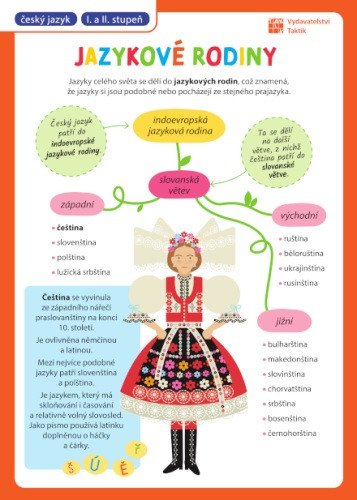 Prehľadová tabuľka: Jazykové rodiny, národný jazyk pre 1. stupeň základnej školy, v jednej tabuľke, ktorá sa zmestí do každého zošita alebo notýska. Tento bohato ilustrovaný a prehľadný malý pomocník sa hodí všetkým, bez ohľadu na to, či je to školák alebo nie.