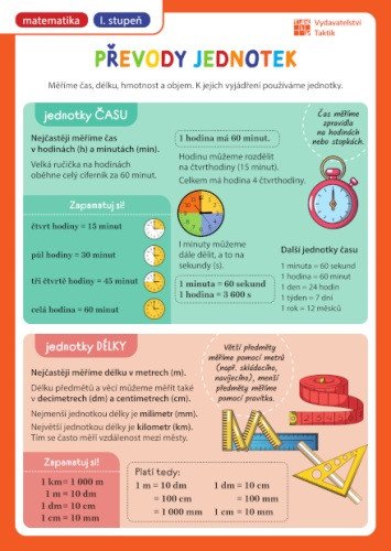 Prehľadová tabuľka: Prevody jednotiek pre 1. stupeň základnej školy, v jednej tabuľke, ktorá sa zmestí do každého zošita alebo notýska. Tento bohato ilustrovaný a prehľadný malý pomocník sa hodí všetkým, bez ohľadu na to, či je to školák alebo nie.