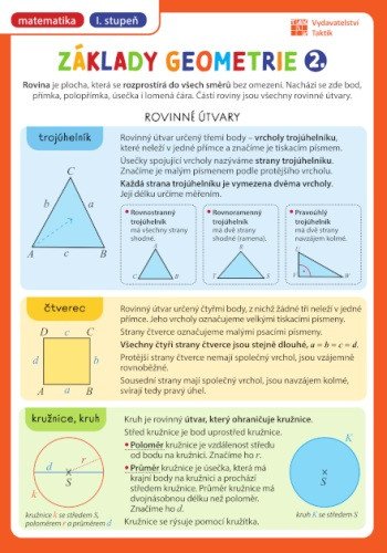 Prehľadová tabuľka: Základy geometrie 2. diel pre 1. stupeň základnej školy, v jednej tabuľke, ktorá sa zmestí do každého zošita či notýska. Tento bohato ilustrovaný a prehľadný malý pomocník sa hodí všetkým, bez ohľadu na to, či je to školák alebo nie.