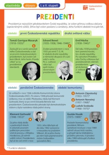 Prehľadová tabuľka: Prezidenti pre 1. stupeň základnej školy, v jednej tabuľke, ktorá sa zmestí do každého zošita alebo notýska. Tento bohato ilustrovaný a prehľadný malý pomocník sa hodí všetkým, bez ohľadu na to, či je to školák alebo nie.