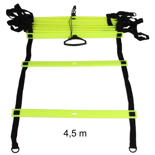 Agility rebrík na kondičnú prípravu športovcov. Plastové priečky rebríka sú ľahko nastaviteľné na prispôsobenie vzdialenosti medzi jednotlivými priečkami podľa potrieb užívateľa. Unikátnym vylepšením je madlo, ktoré je možné pretiahnuť stredom rebríka. Madlo potom slúži nielen ako nosič, ale zabraňuje aj zamotaniu rebríka . Pri oboch variantoch je šírka 53 cm. Upozornenie: Agility rebríky neslúžia v žiadnom prípade na lezenie, ale na cvičenie techniky a rýchlosti športovcov na zemi.