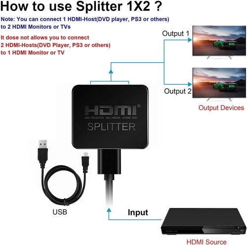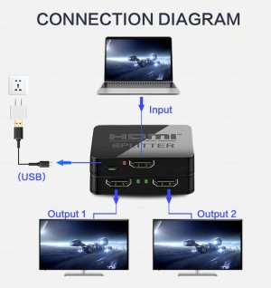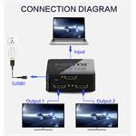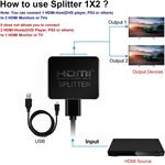 Zapojenie splitteru je otázkou niekoľkých sekúnd. Vstupný port prepojíte so zdrojom signálu a do dvoch výstupných portov pripojíte monitor, televíziu alebo projektor. Pre správnu funkciu je nutné pripojiť priložený USB micro kábel do napájacieho zdroja (napr. USB port v TV alebo sieťový adaptér). Splitter je ideálnym riešením pre prezentácie, školenia alebo domáce kino, kde potrebujete sledovať rovnaký obsah na dvoch miestach naraz.