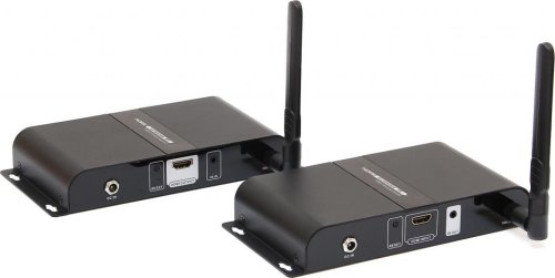 Konektory *Vstupné konektory: HDMI konektor a konektor pre IR ovládanie (kábel s IR čidlom priložený) *Výstupné konektory: HDMI konektor a konektor pre IR ovládanie (kábel s IR čidlom priložený) *Vysielač a prijímač obsahuje dve odmontovateľné anteny, extender je možné doplniť smerovými 5,8 GHz anténami pre zvýšenie spoľahlivosti a dosahu *Extender je napájaný z priložených napájacích adaptérov *Reálna prenosová vzdialenosť závisí od skutočného prostredia.