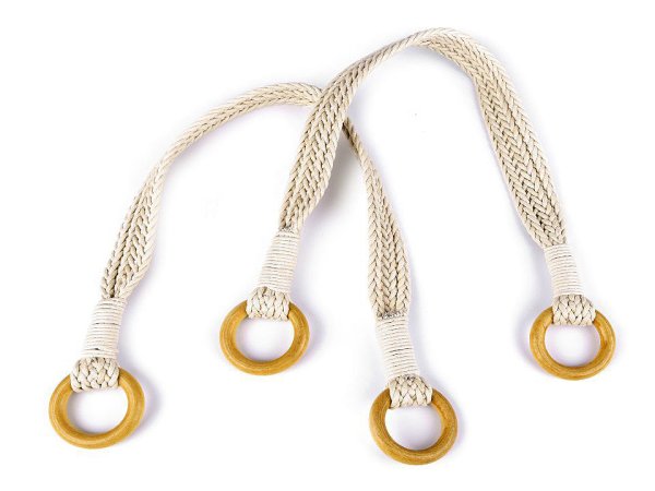 Prepletané uši na tašky sú vyrobené z textilnej voskovanej šnúry, ktorá je na oboch stranách zakončená drevenými krúžkami. Uchá využijete pri výrobe tašiek alebo kabeliek . Celková dĺžka uch môže pohybovať v rozmedzí 50 - 54 cm.