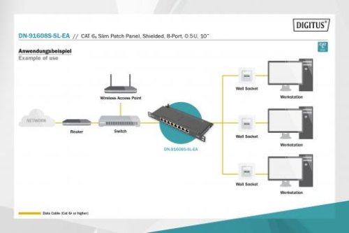 8portový prepojovací panel DIGITUS® 0,5U ponúka vysokú hustotu. Vzhľadom na to, že panel má výšku iba 0,5 U, umožňuje prezentovať 16 portov na 1U (2 panely po 8 portoch), ktoré je možné nainštalovať. Vyhovuje štandardu 802.3at PoE+ a štandardu 802.3af PoE.