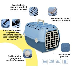 Prepravka je vyrobená z kvalitného odolného plastu a je vybavená ergonomickou rukoväťou s tlmiacim dorazom pre komfortnú manipuláciu. Okrúhle klipy zaisťujú tiché a bezpečné otváranie a zatváranie, čo ocenia ako majitelia, tak zvieratá. Súčasťou sú aj integrované spojovacie body, ktoré umožňujú pripevnenie ramenného popruhu alebo bezpečnostného pásu v aute. Protišmyková podlaha poskytuje vášmu miláčikovi stabilitu a bezpečie počas celej cesty.