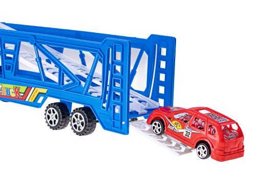 Prepravník áut 38 cm na zotrvačník s autami 5 ks voľný chod - mix farieb (červený prepravník, žltý prepravník)